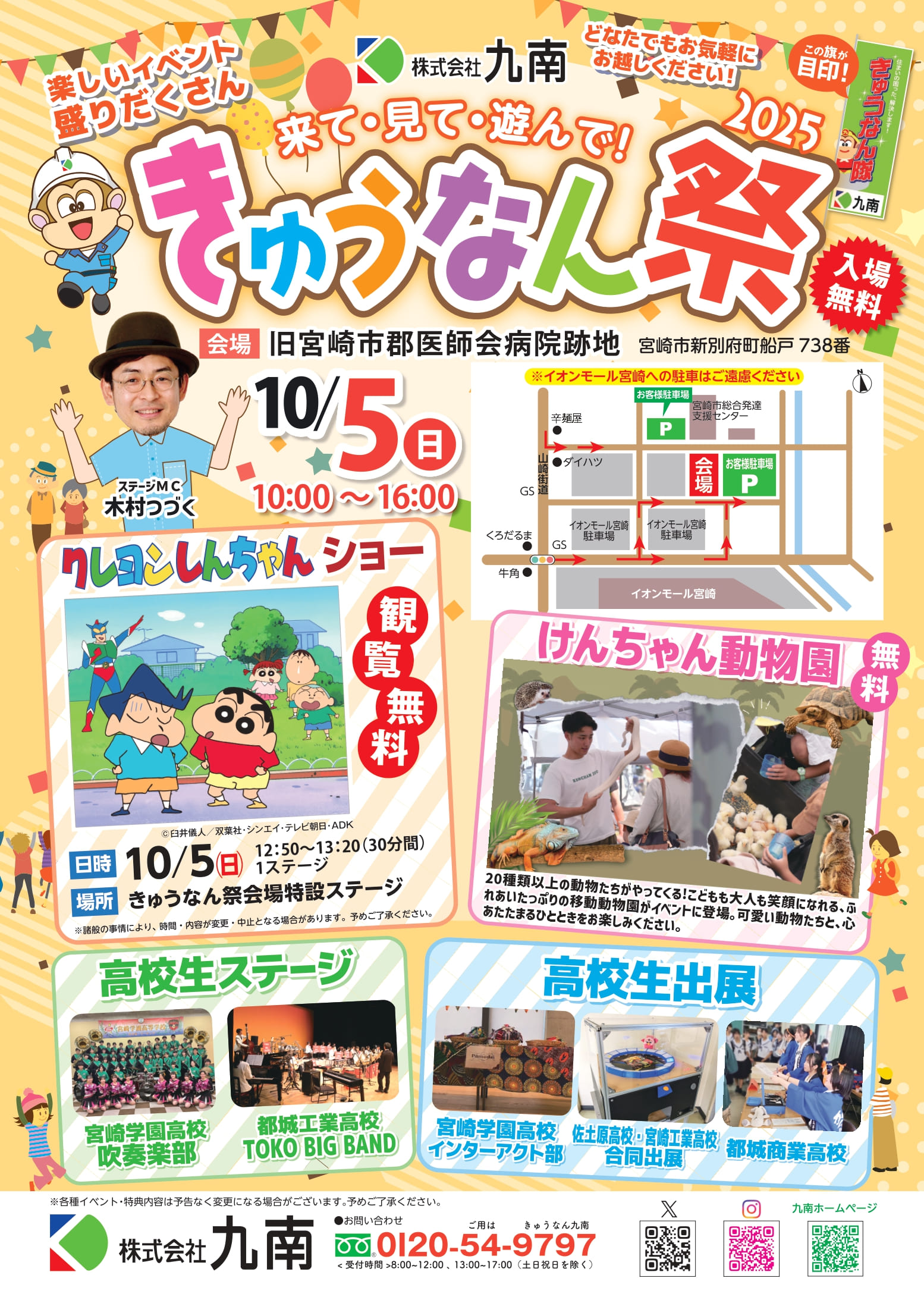 2025年10月5日(日)に宮崎市の旧宮崎市郡医師会跡地(宮崎市新別府町船戸738番)にて「来て・見て・遊んで!きゅうなん祭2025」を開催します。 皆様のご来場を心よりお待ちしております。